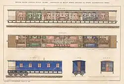 - Die Wagen wurden in der Werkstatt der Eisenbahn Moskau–Nischni Nowgorod (später: Transsibirische Eisenbahn) gebaut, die Inneneinrichtung nahm die Moskau–Kursker Eisenbahn selbst vor.[16] Die Wagen des Zuges waren untereinander mit Faltenbälgen aus Leder verbunden, die nach innen mit Filz isoliert und textil verkleidet waren. Beheizt wurden die Wagen durch sechs über den Zug verteilte Dampfkessel, von denen jeder zwei oder drei Wagen versorgte.[Anm. 1] Die Innenbeleuchtung bestand noch aus Stearinkerzen. Nach Bedarf wurden weitere Fahrzeuge in die Hofzüge eingestellt, die dem Fahrzeug-Pool entnommen wurden, den die Bahn für den öffentlichen Verkehr unterhielt.[1]