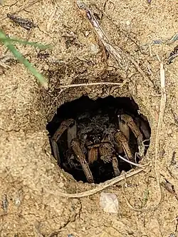Ausgewachsene Individuen der Carolina-Wolfspinne sind vor allem zwischen März und bis zum Juni sowie teilweise darüber hinaus mit dem Anlegen eines Unterschlupfes beschäftigt. Danach kann dies bis zum November nur noch bei den Jungtieren beobachtet werden.[13] Der gegrabene Unterschlupf der Art ist von variabler Beschaffenheit und kann manchmal auch nur bis zu 12 Zentimeter tief sein.[7] Es sollen jedoch auch Wohnröhren mit Tiefen von bis zu 34 Zentimetern vorkommen, so maß Punzo bei seinen Beobachtungen in der Chihuahua-Wüste Wohnröhren der Art, die 21 bis 34 und durchschnittlich 27,8 ± 4,9 Zentimeter tief in den Boden reichen.[14] Die Gestalt der Wohnröhre reicht von geraden, vertikal verlaufenden Gängen bis hin zu vertikalen, stark verzweigten Tunnelsystemen. Die Beschaffenheit der Unterschlüpfe wird wahrscheinlich von der Durchlässigkeit des Bodens und dem Vorhandensein von im Boden befindlichen und beim Bau hinderlichen Objekte, darunter großen Felsen, beeinflusst.[3] Die Wohnröhre der Carolina-Wolfspinne dient wie bei anderen Wolfspinnen (Lycosidae) mit dieser Lebensweise nicht nur als Rückzugsort und Schutz vor Prädatoren (Fressfeinden), sondern bietet insbesondere in Wüsten auch Schutz vor hohen Temperaturen am Tag.[12]