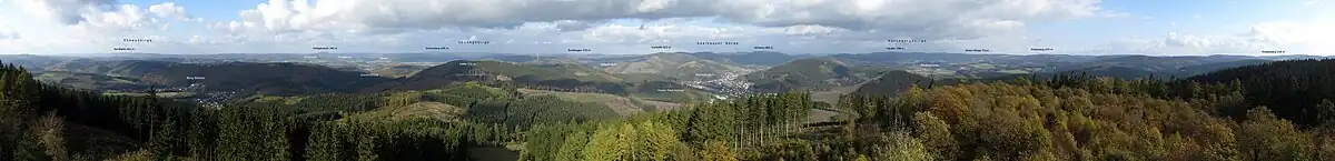 Man schaut über Großteile des Sauerlandes, hinab nach Bilstein (Nordwesten) und Altenhundem (Nordosten), hinüber zum Ebbegebirge (Westnordwesten), zum Lennegebirge (Norden), zu den Saalhauser Bergen (Nordosten) sowie zum Rothaargebirge (Osten; dort bis zum Kahlen Asten; mit Astenturm).
