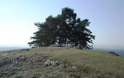 | Der Hohenbol (mit der markanten Gruppe von Schwarzkiefern auf dem Gipfel) – dahinter der Teckberg mit der Burg Teck | ||