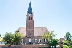 - Pfarrkirche St. Johann Baptist. Der spätgotische Backsteinbau stammt aus dem 15. Jahrhundert. Der vierjochige Wandpfeilersaal wurde in der ersten Hälfte des 18. Jahrhunderts um ein Seitenschiff nördlich erweitert. Der barocke Hochaltar entstand um 1680, die weitere Ausstattung ist rokoko von 1760 bis 1770.