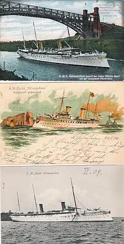 Die Hohenzollern diente von 1893 bis 1918 dem deutschen Kaiser Wilhelm II. als Staatsyacht für repräsentative Zwecke. Das Schiff gehörte zur Kaiserlichen Marine, die es als Aviso in der Liste der Kriegsschiffe führte. Als Begleitschiff diente ab 1900 das Depeschenboot Sleipner.
