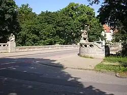 Aufgrund der Lage der Brücke in einem Villenviertel erhielt das Bauwerk zur Verschönerung besonders gestaltete Flügelbrüstungen mit Skulpturen aus Muschelkalk, allegorischen Figuren vom Erfurter Bildhauer Carl Melville. Auf der südlichen Seite symbolisieren die Figur mit Hammer und Steinplatte die Arbeit und die Figur als Sitzende mit Fruchtschale die Ernte. Auf der nördlichen Seite weist die Liegende mit Spiegel auf die Schönheit und der Liegende mit Weinschale auf den Genuss hin.[1] Die künstlerische Gestaltung war 1913 abgeschlossen und kostete 10.000 Mark.