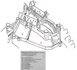 Die hufeisenförmige Kernburg öffnet sich nach Osten. Die dreigeschossigen Seitenflügel werden von spätgotischen, fialengeschmückten Giebeln abgeschlossen. Aus der Giebelfront springt der Chor der Burgkapelle polygonal aus. Im Westen wacht der mächtige Bergfried (Gefängnisturm) über die Veste. Der Turm ist durch kurze Verbindungsbauten mit den Seitenflügeln verbunden. Über dem Nordosteck liegt der Storchenturm, der ursprünglich „Hohes Haus“ genannt wurde. Der Wohnturm trägt ein hohes Satteldach mit Giebelfialen.