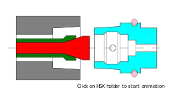 - Der Hohlschaftkegel (Innenteil) ist im eingezogenen Zustand elastisch druckvorgespannt. Im Gegensatz zum voll ausgeführten Steilkegel erfolgt die Aufweitung des hohlen Innenteils durch Zentrifugalkraft näher an der gleichzeitig erfolgenden Aufweitung des Außenteils. In Verbindung mit der Spannkraftreserve aus elastischer Kompression des Innenteils ist eine zuverlässige Drehmomentübertragung bei höherer Drehzahl noch gegeben als beim Steilkegel.