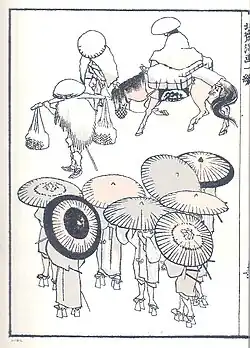 Der erste Manga (von Hokusai als „Wildgewordener Pinsel“ bezeichnet) war eine Anleitung zum Malen, um ihm aus seiner finanziellen Not zu helfen. Wenig später entfernte er den Text und veröffentlichte es neu.[3] Der Manga zeugt von einer Hingabe an den künstlerischen Realismus in der Darstellung von Menschen und der Natur. Die Arbeit war ein sofortiger Erfolg und Fortsetzungen folgten bald. Die Arbeit wurde in der westlichen Welt bekannt, nachdem Philipp Franz von Siebold einige Arbeiten in sein Nippon: Archiv Zur Beschreibung von Japan aus dem Jahr 1831 einfließen ließ. Die Bücher begannen nach dem Eintreffen Matthew C. Perrys in 1854 in der westlichen Welt zu zirkulieren.[4][5]