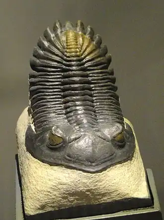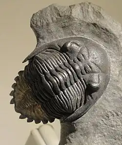 - Die Genalstacheln[2] gehen vom Cephalon aus und sind so lang wie die Glabella,[3] sie reichen ungefähr bis zum 6. Brustsegment (Thoraxsegment).