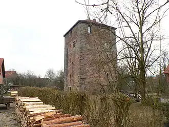 In der Dorfmitte steht ein mächtiger Wehrturm mit quadratischem Grundriss und fünf Geschossen, der Dicke Turm genannt. Es ist der Rest der mittelalterlichen Burg Holzheim. Der Turm ist heute in Privatbesitz und wird als Wohnanlage genutzt. Er wurde in der Mitte des 12. Jahrhunderts als Wohnturm der Burg errichtet. Einer Sage nach wurde bei seinem Bau ein Kind lebendig eingemauert. Die drei in etwa 12 m Höhe an der Außenwand sichtbaren steinernen Köpfe zeigen einen Mann, eine Frau und ein Kind und werden mit dieser Sage in Verbindung gebracht.