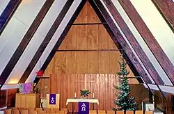 Das zeltförmige Kirchengebäude wurde als Nurdach-Konstruktion in Holzbauweise errichtet und besteht überwiegend aus Holz. Beim Giebel an der Eingangsseite ist das gesamte Giebeldreieck oberhalb der Eingangstür als Fensterfläche mit 13 vertikalen Unterteilungen und zwei horizontalen Unterteilungen ausgebildet, so dass sich hochformatige und entlang der Dachanschlüsse abgeschrägte Einzelglasflächen ergeben. Auf den sonst weiß gestrichenen Fensterprofilen aus Holz befindet sich an der Außenseite mittig ein abgesetztes, goldenes Kreuz.