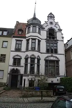 Das Haus wurde um 1880 erbaut. Die zweigeschossige Halbvilla mit Giebelgeschoss hat ein hohes Sockelgeschoss. Die Putzfassade hat eine Werksteingliederung. Auf dem dreigeschossigen Erkerturm sitzt eine achtseitig geschweifte Schieferhaube mit lanzenartiger Spitze.