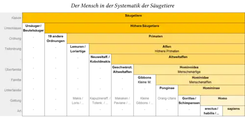 Einen ersten Versuch, die Gattung Homo anhand von anatomischen Merkmalen von anderen Säugetieren abzugrenzen, unternahm 1775 Johann Friedrich Blumenbach in seiner Dissertation De generis humani varietate nativa („Über die natürlichen Verschiedenheiten im Menschengeschlechte“).[13]