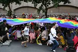 Am ersten November 2003 fand mit etwa 1000 Teilnehmern in Taipei die Taiwan Pride statt, die erste Schwulen- und Lesbenparade in der chinesischsprachigen Welt.[15] Seitdem findet sie jährlich statt. In den ersten Jahren trugen viele Mitläufer Masken aus Angst vor gesellschaftlicher Demütigung. Doch die Parade im Oktober 2007, an der zwischen 10.000 und 15.000 Menschen verschiedenster Gruppen teilnahmen, zeigte mit ihrer Vielzahl von Teilnehmern, dass Toleranz und Akzeptanz der Gesellschaft Taiwans im Schnellschritt voranschreiten. Die Veranstaltung entwickelte sich zu einem jährlichen Ereignis. Bei der bislang größten Parade im Oktober 2016 nahmen geschätzt 80.000 Personen teil.[16]