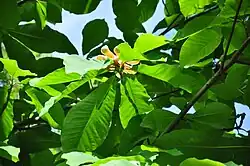 Die wechselständigen, meist an den Enden der Zweige gehäuft angeordneten Laubblätter sind in Blattstiel und -spreite gegliedert. Der kurze Blattstiel ist 2 bis 3 Zentimeter lang. Die einfache, ganzrandige Blattspreite ist bei einer Länge von 20 bis 40 Zentimetern sowie einer Breite von 13 bis 25 Zentimetern verkehrt-eiförmig, mit gerundeter bis spitzer Spreitenbasis, und die Spitze ist gerundet, stumpf bis bespitzt. Die etwas bläulich, glauk gefärbte Blattunterseite ist flaumig behaart. Die Blattoberseite ist kahl.[2] Nebenblätter sind vorhanden und fallen bald nach dem Entfalten des zugehörigen Laubblattes ab.