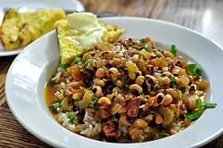 Hoppin’ John ist eine Speise aus der Südstaatenküche, zubereitet aus Augenbohnen und Reis mit fettem Schweine-[1] oder Rindfleisch.[2] Es wird oft mit Blattkohl und Maisbrot serviert. Es ist in Charleston (South Carolina) und im Süden der USA ein übliches Neujahrsgericht. Hoppin’ John wird am Neujahrstag von allen Gesellschaftsschichten und Altersgruppen aus dem Süden gegessen. Die auf Englisch sogenannten black eyed peas (Schwarze-Augen-Erbsen) sollen Glück bringen und der dazu gereichte Grünkohl soll im kommenden Jahr Wohlstand bringen.[2] In vielen Haushalten wird kurz vor dem Servieren ein Dime in den Topf gerührt; Wer die Münze findet, wird dem Aberglauben nach im kommenden Jahr das meiste Geld haben.[3]