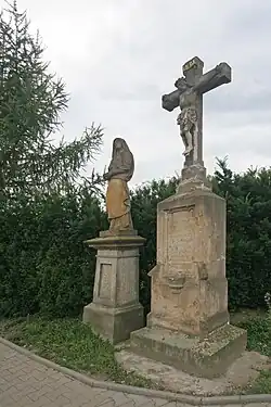 - Steinernes Kreuz und Marienstatue im Ortszentrum