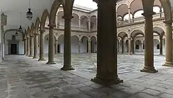 Das Hospital verfügt über zwei nebeneinanderliegende große Innenhöfe, die von einem Mittelgang getrennt werden und jeweils von doppelgeschossigen Arkaden mit monolithischen Säulen umstellt sind. Die Arkadenbögen der unteren Ebene sind reicher profiliert; in den Zwickeln befinden sich Halbkugeln aus bläulichem Marmor. Die Arkaden der oberen Ebene sind durch eine Balustrade gesichert. Die vergleichsweise schlanken Säulen haben ionische Kapitelle; die Zwickel sind lediglich durch Blumenmedaillons mit Flachreliefs gefüllt. Beachtenswert ist der Kontrast zwischen den weißverputzten Wänden und Decken des Gebäudes und dem bräunlichen Farbton der Natursteinarkaden.