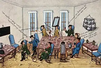 Hospitium in Jena, Stammbuchmalerei um 1750: Der Gastgeber (links im Hausmantel mit Hausschlüssel) lässt seine Gäste trinken, „biß ihr unter dem tisch liegt“.