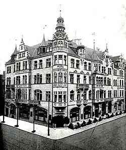 Der Vorgängerbau des Hotels befand sich an der Benrather Straße 3.[2][3] Von 1903 bis 1904 erbaute Josef Kleesattel das viergeschossige Eckhaus mit Natursteinfassaden an der Ecke Steinstraße 70 (heute Stresemannstraße 26). Bauherr war der Bauunternehmer F. W. Zensen.[4] Während die Außenarchitektur von Josef Kleesattel gestaltet wurde, entwarf Hermann vom Endt die damals mit dem Hotel verbundenen Bier- und Weinstuben. In den Räumlichkeiten des Hotels fand 1908 die Gründung des Düsseldorfer Yachtclubs statt.