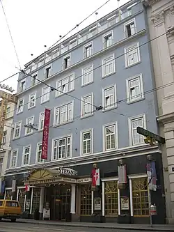 Zum anderen war der Saal des Hotels Stefanie von 1908 bis 1921 Schauplatz des Ensembles „Jüdische Bühne“, der „Keimzelle des jiddischen Theaters in Wien“.[24]