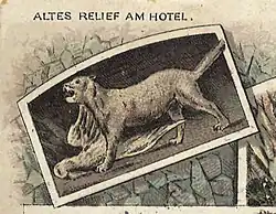 Am Hotel ist das Relief des namengebenden Tieres über einem gerissenen Vogel zu sehen.