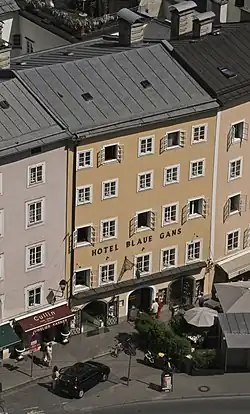 Das Hotel Blaue Gans befindet sich im ehemaligen Sprinzenbergerhaus in der Getreidegasse Nr. 43 von Salzburg.