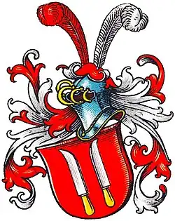 Blasonierung: In Rot zwei mit den Rücken gegeneinander gekehrte silberne Messer mit goldenen Griffen. Auf dem Helm mit rot-silbernen Helmdecken eine (rechts) rote und eine silberne Straußenfeder.[1]