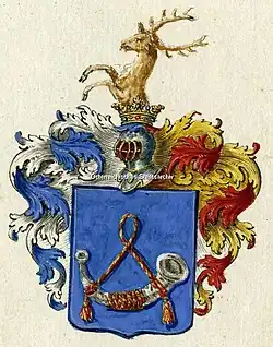 Blasonierung: In Blau ein silbernes Hifthorn mit rot-goldenen Schnüren. Auf dem gekrönten Helm mit rechts blau-silbernen und links rot-goldenen Helmdecken ein wachsender natürlicher Hirsch.