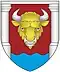 Beschreibung: In Rot ein goldener Wisent. Auf dem Schild ruht eine fünftürmige goldene Mauerkrone. Zwei goldene Eichenzweige mit blauem Band umgeben den Wappenschild.
