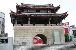 1826 forderten 47 Mitglieder der lokalen Oberschicht, u. a. der erste Jinshi (進士 / 进士, jìnshì) Taiwans Zheng Yongxi (鄭用錫 / 郑用锡, Zhèng Yòngxí), eine Mauer aus Stein zu errichten, welche von den Einwohnern finanziert werden sollte. Dem Anliegen wurde stattgegeben und eine neue Stadtmauer mit Graben und vier Turmtoren wurden gebaut: das Osttor Yingxi (迎曦, Yíngxī), das Westtor Yishuang (挹爽, Yìshuǎng), das Südtor Gexun (歌薰) und das Nordtor Gongchen (拱辰). Des Weiteren wurden die zu den Toren führenden Straßen auf 3,8 m erweitert. Heutzutage sind nur noch das Osttor und Teile des Grabens erhalten geblieben.