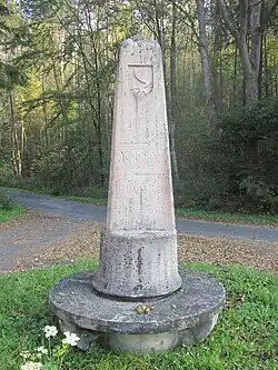 Der Wegweiser aus Kunststein entstand um 1925 und besteht aus einem 210 cm hohen Obelisk, der von einer 47 cm hohen Rundbank mit 145 cm Durchmesser umgeben ist.