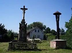 - Steinernes Kreuz und Dorfglocke auf dem Dorfplatz