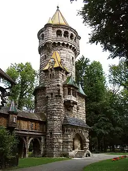 Häufig weilte Herkomer während des Sommers in Deutschland, meist in Bayern. In Landsberg am Lech, wo die 1879 verstorbene Mutter ihre letzten anderthalb Lebensjahre verbracht hatte, erwarb Herkomer Baugrund neben dem früheren Wohnhaus der Eltern und begann, einen 30 Meter hohen Turm errichten zu lassen, was sich aus Kostengründen bis etwa 1887 hinzog.[16] Heute gehört der Turm zum Herkomer Museum.