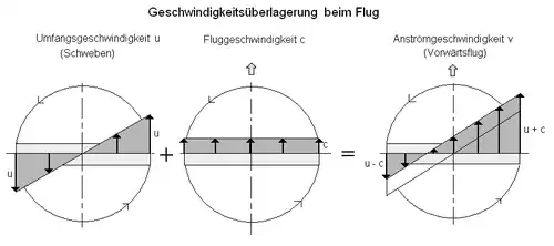Wenn ein Hubschrauber sich vorwärts bewegt, ändert sich die Anströmgeschwindigkeit, da sich Umlauf- und Fluggeschwindigkeit des nach vorne bewegten Blattes addieren. Beim zurücklaufenden Blatt subtrahieren sie sich, siehe auch die Skizze weiter unten.