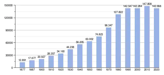 Im Jahre 1787 hatte die Stadt 5.377 Einwohner, 1857 8.519. Ende der 1880er Jahre begann dann der starke Bevölkerungsanstieg. 1887 erreichte man mit 18.195 eine Verdopplung in nur 30 Jahren. In den ersten Jahren des 20. Jahrhunderts stieg die Zahl auf 21.359 Einwohner, vierzig Jahre später bereits 56.427. Im Jahr 1960 wurden 74.384 Personen registriert, zehn Jahre später, als die ersten Chemiefabriken errichtet worden waren, 96.689.[7] Ein weiterer Anstieg der Bevölkerung folgte. 127.806 Einwohner im Jahr 1981 und 144.479 im Jahr 1991.