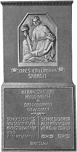 - Karl Masner und Hans Seger (Hrsg.): Jahrbuch des Schlesischen Museums für Kunstgewerbe und Altertümer (= Schlesiens Vorzeit in Bild und Schrift. Neue Folge). Breslau 1909, Band 5, S. 270 (Hugo Milch †), 288 (im Artikel Das fünfzigjährige Jubiläum des Vereins)