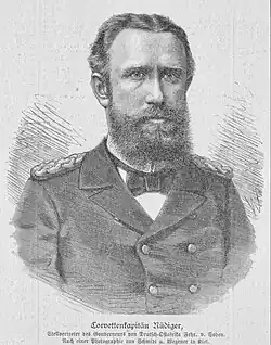 Im Jahr 1893 trat Korvettenkapitän a. D. Rüdiger in die Dienste der Neuguinea-Kompagnie. Er sollte vornehmlich die Vertretung des Landeshauptmanns in Behinderungsfällen übernehmen. Nach seiner Ankunft im Schutzgebiet im November 1893 wurde er zum Vorsteher der Zentralstation Friedrich-Wilhelmshafen in der Astrolabe Bay und bald danach auch zum Vorsteher des Arbeiterdepots daselbst ernannt. Zugleich wurde er mit der Wahrnehmung der Gesundheitspolizei in den dortigen Häfen betraut. Seit der Beurlaubung des Landeshauptmanns Georg Schmiele, der am 3. März 1895 in Batavia starb, wurde Korvettenkapitän a. D. Rüdiger mit der Führung der Geschäfte der Landeshauptmannschaft betraut.[4]