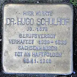 Hugo Schulhof wurde am 7. November 1878 als Sohn des jüdischen Kaufmanns Josef Schulhof und seiner Frau Hannchen, geb. Moses, in Osnabrück geboren. Er besuchte das Ratsgymnasium und legte dort 1896 zusammen mit seinem Bruder Max das Abitur ab. Danach studierte er Rechtswissenschaften in Leipzig, Berlin und Göttingen. 1899 bestand er das 1. und im Juli 1905 das 2. Staatsexamen. In Göttingen promovierte Schulhof 1899 zum Thema Die Gewährleistung für Rechtsmängel beim Kauf. Er war Soldat im Ersten Weltkrieg und erhielt später das Eiserne Kreuz. Im April 1922 wurde Rechtsanwalt Dr. Schulhof zum Notar ernannt. Nachdem er zur evangelischen Konfession konvertiert war, heiratete er am 31. Januar 1928 die Opernsängerin Vlasta Frantiska Marsalkova (* 1896 in Prag). Hugo Schulhof arbeitete in einer sehr erfolgreichen Sozietät mit den Rechtsanwälten Thalheim und Sandhaus in der Möserstr. 9b. Nach der Machtübernahme der Nationalsozialisten wurden jüdische Rechtsanwälte und Notare diskreditiert, die SA zwang die Bürger zum Boykott und das Betreten des Gerichtes wurde verboten. Das Notaramt wurde Schulhof am 1. Oktober 1935 vom Präsidenten des Oberlandesgerichts Celle entzogen. Das Ende seiner Tätigkeit als Rechtsanwalt wurde ihm mit einem Bescheid vom 21. Oktober 1938 angekündigt. Mit Ablauf des 30. Novembers 1938 verlor er die Zulassung. Durch Bescheide des Finanzamtes Osnabrück wurde er gezwungen, 1938 insgesamt 10.000 Reichsmark und 1939 weitere 2.350 Reichsmark zu zahlen. Es sollten weitere Zwangsabgaben und Beschlagnahmungen folgen. Zuerst 1938 und dann erneut 1939 wurde er durch die SA in das KZ Sachsenhausen verschleppt. Vor und nach der Entlassung wurde das Ehepaar von SA-Angehörigen schikaniert und ihre Wohnung häufig durchsucht. Die Gesundheit von Hugo Schulhof wurde durch diese Nöte und Repressalien stark geschädigt. Als Jude war er allerdings von ärztlichen Behandlungen ausgeschlossen worden. Er fand nach langer Suche jedoch zwei Osnabrücker Hausärzte, die eine Behandlung wagten. Sie brachten nach dem Krieg zum Ausdruck, dass die Sorgen, Misshandlungen und Pressionen durch die Nationalsozialisten seine Gesundheit so sehr schädigten, dass Hugo Schulhof am 13. November 1944 in Osnabrück an Herzversagen starb. Seine Frau Vlasta überlebte den Krieg und wohnte bis 1986 in Osnabrück.