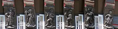 Die Fassade besteht aus reich geschnitzten Figurenfriesen und Knaggen aus der Werkstatt von Simon Stappen. Thematisch behandeln die Darstellungen Allegorien auf Götter der hellenistischen Mythologie sowie auf Tierkreiszeichen. Die Friese weisen eine große Ähnlichkeit zu der vom selben Baumeister geschaffenen Fassade des „Brusttuches“ in Goslar.