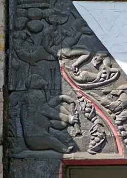 Die Inschrift nimmt Bezug auf den dudelsackspielenden Affen am ersten Ständer links oben, mutmaßlich eine heitere Selbstironie des damaligen Erbauers.