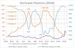 - ↑ Hurricane Florence downgraded to Cat. 2 storm. AJC, 12. September 2018, archiviert vom (nicht mehr online verfügbar) am 13. September 2018; abgerufen am 12. September 2018 (englisch). Info: Der Archivlink wurde automatisch eingesetzt und noch nicht geprüft. Bitte prüfe Original- und Archivlink gemäß Anleitung und entferne dann diesen Hinweis.