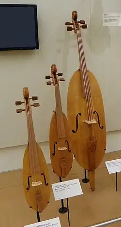 Informationen zu Fideln aus dem 15. Jahrhundert sind zu einem großen Teil Johannes Tinctoris zu verdanken. Bis dahin französisch viele genannt, hießen die von der byzantinischen lira abstammenden Streichinstrumente ab dem 15. Jahrhundert französisch viole oder vyolon, englisch vyell, italienisch viola, niederländisch vedel und später deutsch Fiedel.[42] Gemeinsam ist den Fideln eine der späteren Violine ähnliche Haltung und Spieltechnik. Tinctoris unterschied bei den gestrichenen viole drei Formen: eine mit einem flachen Boden und mehr oder weniger stark taillierten Seiten an einem Korpus, der kleiner als derjenige der Laute ist. Eine zweite viole, von der man glaubte, sie sei von den Griechen eingeführt worden, hat eine etwas andere Form und Besaitung als die Laute. Die dritte Form ist ein kleines, von den Franzosen rebec genanntes Instrument mit einem wie bei der Laute halbrunden (wörtlich testudineum, „schildkrötenpanzerförmigen“) Korpus.[43] Der erste Typ (gitarrenförmiger Korpus, C-förmige Schalllöcher, drei oder fünf Saiten) war während des gesamten 15. Jahrhunderts die typische Form in Westeuropa und blieb weiterhin als Nischeninstrument in der Volksmusik erhalten, während sich im 16. Jahrhundert die heutige Form der Violine durchsetzte.