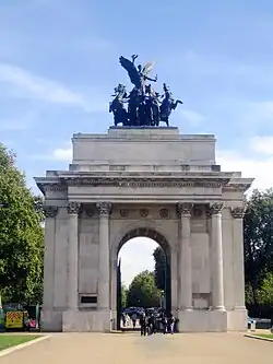 Im Südosten an der Hyde Park Corner befinden sich nicht nur der Rosengarten mit dem Boy and Dolphin Fountain und dem Artemis Fountain, sondern auch der monumentale Triumphbogen „Wellington Arch“, der zu Ehren von Arthur Wellesley, 1. Duke of Wellington, Sieger der Schlacht bei Waterloo, errichtet wurde. Der Eingang an der Hyde Park Corner wurde ursprünglich von Decimus Burton (1800–1881) entworfen.[1] Hinter dem Wellington Arch schließt sich der Green Park an.