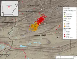 Tatsächlich gingen von den fünf östlich der Rocky Mountains im Jahre 2011 registrierten seismischen Ereignissen mit Hauptbeben, deren Momenten-Magnitude 4,0 oder mehr betrug und die nachweislich mit der Kohlenwasserstoffförderung in Zusammenhang standen, zwei relativ sicher und eines wahrscheinlich auf die Verpressung von Abwasser zurück:[91] So führte eine Reihe stärkerer Beben an der bis Herbst 2010 unbekannten Guy-Greenbrier-Störung im US-Bundesstaat Arkansas, von denen eines (27. Februar) MW 4,7 erreichte, zu einem Moratorium, das u. a. die Niederbringung neuer Bohrlöcher für die Abwasser-Verpressung im Bereich der Guy-Greenbrier-Störung dauerhaft untersagt.[94][95] Am 23. August ereignete sich bei Trinidad im Raton-Becken im Süden des US-Bundesstaates Colorado ein Beben mit MW 5,3. Es handelte sich um das stärkste einer ganzen Reihe spürbarer Erdbeben, die seit 2001 in der bis dahin seismisch eher unauffälligen Region bis hinüber nach New Mexico gehäuft auftraten. Wahrscheinlicher Auslöser ist die seit 2001 dort durchgeführte Verpressung großer Volumina von Abwasser aus der CBM-Förderung.[96] Die stärkste Erdbebenserie ereignete sich im November bei Prague in den Wilzetta-Ölfeldern im US-Bundesstaat Oklahoma. Drei ihrer Erdbeben erreichten MW ≥ 5,0 und das stärkste (6. November) sogar MW 5,7. Es handelte sich um das bislang (Stand: 2015) schwerste jemals in Oklahoma mit Instrumenten aufgezeichnete Erdbeben und das schwerste, das bislang im Gefolge verpresster Abwässer auftrat. Es zerstörte zwei Einfamilienhäuser und beschädigte weitere Gebäude. Zwei Menschen wurden verletzt.[97] Am 30. Dezember musste die Verpressungsanlage „Northstar I“ nahe Youngstown in Ohio stillgelegt werden, nachdem ein Erdstoß mit MW 2,7 direkt auf ihren Betrieb zurückgeführt werden konnte. Einen Tag später ereignete sich sogar ein spürbares Beben, das mit 3,9 knapp unterhalb der Momenten-Magnitude von 4,0 lag. Die verpressten Abwässer stammten aus der Kohlenwasserstoffförderung im Marcellus Shale im benachbarten Pennsylvania.[93]