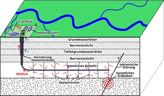 Generell bestehen bei allen Bohrtechniken Umweltrisiken, insbesondere wenn sie mit der Förderung fossiler Kohlenwasserstoffe in Zusammenhang stehen. Diese Risiken sind jedoch beim Fracking zur Förderung von Schieferöl und -gas aufgrund der hohen Anzahl und Dichte an Bohrungen und Bohranlagen einerseits erhöht und zum anderen bestehen zusätzliche Risiken, weil dem Fracking-Fluid Chemikalien, u. a. Biozide, zugesetzt werden.[53][54] Risiken bei der Erdöl- und Erdgasförderung mittels Fracking bestehen im Einzelnen hinsichtlich: