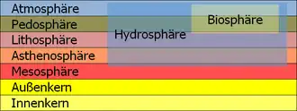 - Sublithosphärische Hydrosphäre: Wässer unterhalb der Lithosphäre in Asthenosphäre und oberer geosphärischer Mesophäre.[45][46][47]