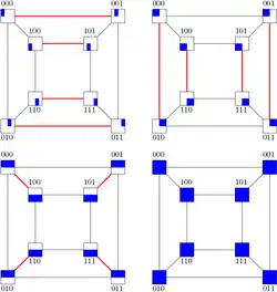 Der -dimensionale Hyperwürfel ist eine Netztopologie für Rechnerbündel mit Rechnern. Sie erlaubt eine effiziente Implementierung der Kommunikations-Grundmuster Broadcast, Gossip, All-Reduce und der Partialsummenbildung.[1] Dazu werden die teilnehmenden Rechner von bis binär durchnummeriert. Jeder Rechner besitzt dann eine direkte Verbindung zu den Rechnern, deren Nummern sich in genau einem Bit von unterscheiden. Diese Struktur wird von den folgenden Algorithmen effizient ausgenutzt.