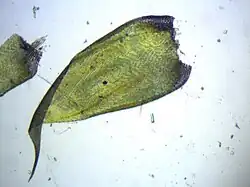 Die Blätter sind ganzrandig oder höchstens an der Spitze etwas gezähnt. Sie haben nur eine kurze Doppelrippe, die zuweilen sogar fehlt. In den Blattflügeln befindet sich eine Gruppe von deutlich differenzierten Zellen.