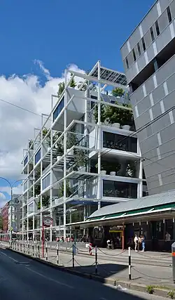 Das Gebäude ist in Skelettbauweise mit Stahlbeton errichtet. Die Fassade erinnert an überdimensionierte Regale, die mit großen weißen Töpfen bestückt sind, aus denen Bäume wachsen. Insgesamt befinden sich 90 solcher mit Feuchtigkeitssensoren und automatischer Bewässerung ausgestadteten Töpfe auf der Fassade und 70 auf der Dachterrasse.[5]