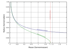 - ↑ In diesem Zusammenhang ist erklärend hinzuzufügen, dass sich die Mitglieder der Gruppe der Weißen Zwerge eng um einen mittleren Wert von 0,5–0,7 Sonnenmassen verteilen. Nur 2 % aller Weißen Zwerge besitzen mindestens die Masse unserer Sonne.