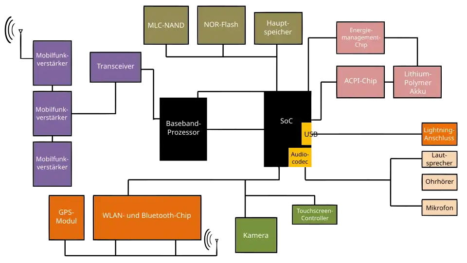 Alps Denki (Kompass), Authentec (Touch-ID-Sensor), Bosch (Beschleunigungssensor), Broadcom (Touchscreen-Controller, Controller-Chips, Hochfrequenz-Modul), Cirrus Logic (Audio-Chipsatz), Corning (Bildschirm), Fairchild (Halbleiter), Globalfoundries (Chipsatz, Prozessor), Green Point (Kunststoffhülle des iPhone 5c), GT Advanced Technologies (Bildschirm), Hi-P (Kunststoffhülle des iPhone 5c), Huizhou Desay Battery (Akkumulator), Japan Display (Bildschirm), LG Display (Bildschirm), Maxim Integrated (Halbleiter), NXP Semiconductors (Mixed-Signal-Chip, NFC-Chip), OmniVision (Frontkamera), PMC-Sierra (integrierte Schaltkreise), Qorvo (Sender, Verstärker), Qualcomm (Modem/Baseband-Prozessor, Hochfrequenz-Modul), Intel (Modem/Baseband-Prozessor), RF Micro Devices (Hochfrequenz-Modul), Samsung (Akkumulator, Chipsatz, Prozessor, Flash-Speicher), Sharp (Display), Skyworks (Sender, Verstärker), SK Hynix (DRAM), Sony (Kamera), STMicroelectronics (Gyroskop), TDK (Induktionsspulen), Texas Instruments (Halbleiter), Toshiba (Flash-Speicher), TriQuint Semiconductor (Hochfrequenz-Modul), TSMC (Chipsatz, Kamera, Touch ID-Sensor, Prozessor, DRAM), Win Semiconductors (Hochfrequenz-Modul), Xintec (Touch ID-Sensor).